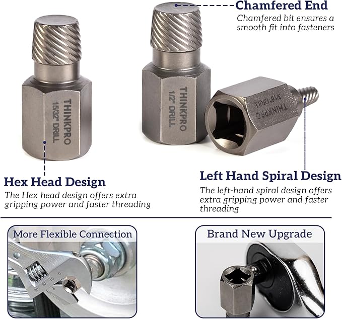 - 【Versatile usage】Suitable for both power tools and hand tools, including Wrench/ Ratchet/ Drill/ Impact. The high-density spiral design helps faster remove broken screws, bolts, nuts, studs, fittings, threaded pipes, and pins. Not only as automotive tools, but also as a helper of home decor or craft production.