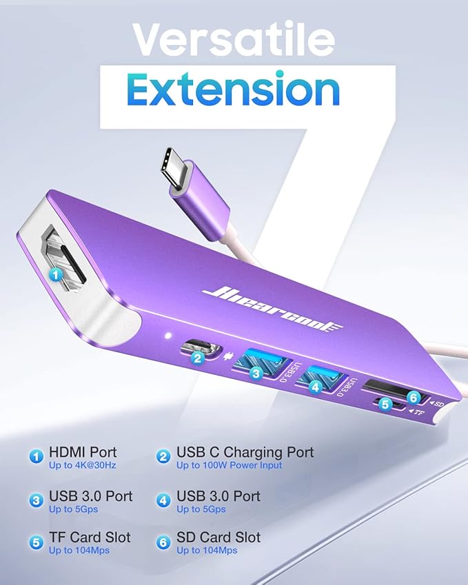 - UL/SGS Approved USB C Hub (USB C adapter) – Expand one USB-C port to HDMI 4K@30Hz, 2× USB-A 3.0 (5Gbps), SD & microSD card slots, and USB-C PD pass-through (up to 100W) for everyday work and study