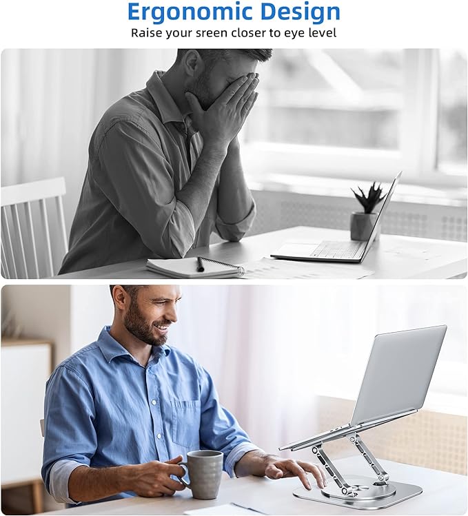 - 360°Rotation:Laptop stand for desk 360° rotatable, Two-axis connecting with the base, makes the rotation more flexible, allows you to swivel your laptop to any angle. It is very suitable for sharing content in meetings or communication