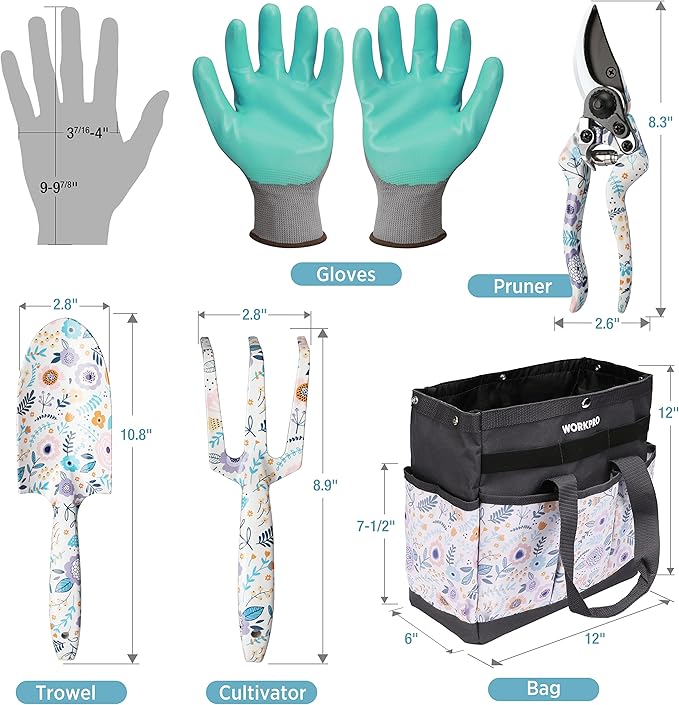 - FLOWER PATTERN GARDEN TOOL SET- Contains a garden tool bag, 3 gardening hand tools(trowel, rake, pruning shear) printed with flower patterns and a pair of durable garden gloves for gardening scenes such as planting, digging, loosening and transplanting to help you with all your gardening work needs! Stylish flower gardening sets will bring you a different gardening experience