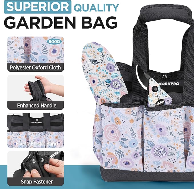 - IMPROVED GARDEN STORAGE BAG- This garden bag is made of high quality 600D polyester fabric lining with soft materials, which is very soft and durable. The bottom of this bag is reinforced with PE board, keeping the tool bag upright, more stable and not deformed. The anti-slip strap handle is comfortable and soft, reducing fatigue when carrying. Interior size of 12''x 12'' x 6'' and multi-pockets design provides enough space for storage