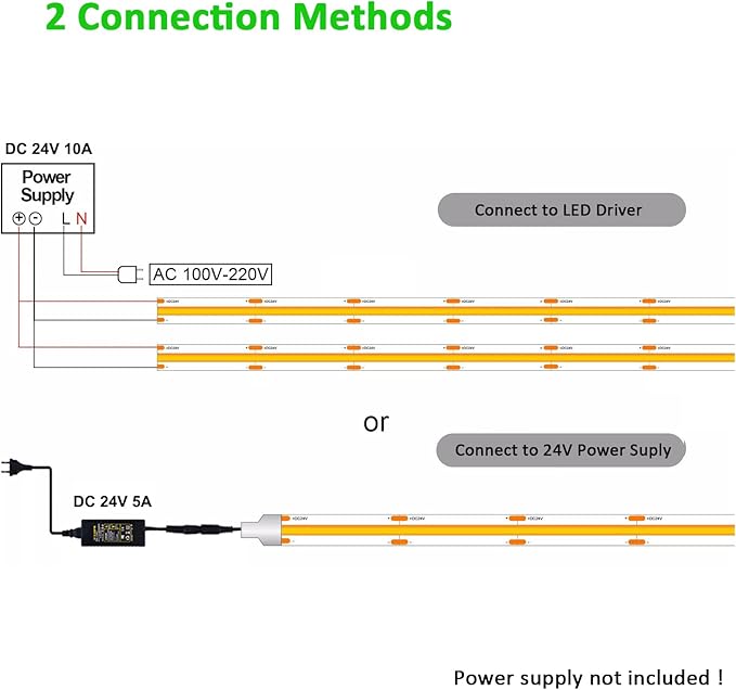 - [ How to Choose the Right Power Supply ]: Input voltage must 24V, the wattage is depend on the length of the light strip, this 480LEDs/M LED tape is about 5.5W/FT, so the wattage of the power supply should be 5.5*length*1.2 ( better leave a 20% capacity ), if lack of wattage, the lights may dim or blink.