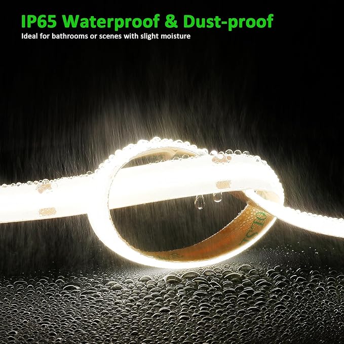 - [ IP65 Waterproof LED Strip ]: The COB LED strip is sealed by silicone glue up to IP65 waterproof, it can be installed anywhere even in wet places, like kitchen cabinets, bathrooms, decks, boats, etc. The silicone can protect the light strips from dust and moisture, besides this, the lighting effect is wider and brighter. The material will not crack nor turn yellowish during years of operation.