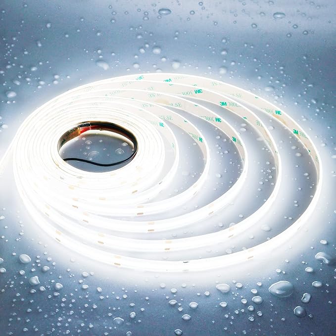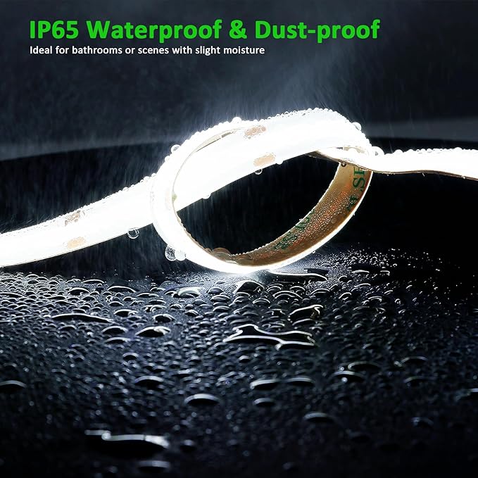 - [ Indoor and Outdoor Use ]: This waterproof COB LED light strip is sealed with clear silicone glue, up to IP65 waterproof rate. It can be installed anywhere even in wet places, like kitchen cabinets, bathrooms, backyards, decks, boats, stairs, etc. The silicone can protect the light strips from dust and moisture, besides this, the lighting effect is wider and brighter. The material will not crack nor turn yellowish during years of operation.
