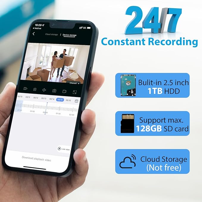 - 24/7 Recording & NVR 10 Channels: Upgraded H.265+ tech is able to occupy less storage space without decreasing image quality, which can extend the recording duration. The 1TB hard drive preinstalled ensure a recording over 45 days under 24x7 video recording mode. No Monthly fees is needed. The NVR supports 4K image output and max. 10 Channels cams recording at the same time. (NOTICE: THE CAMERAS ARE NOT SOLAR POWERED. THEY NEED PLUG-IN POWER SUPPLY)