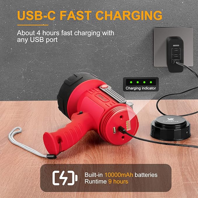- FOUR HOURS FAST CHARGING: With advanced USB-C charging technology, recharge in just 4 hours. Compatible with any USB charging port, you can charge this rechargeable spotlight at home or in your car.(charging adapter is not included).