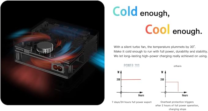 - 【Cold enough,Cool enough】 With a silent turbo fan, the temperature plummets by 30°. Make it cold enough to run with full power, durability and stability. We let long-lasting high-power charging really achieved on using.7 days/24 hours full power export Overheat protection triggers after 2 hours of full power operation, charging stops,make your charging work fast and safe.