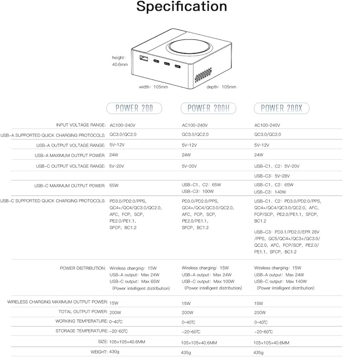 - 【PD 3.1 multiple device charger stationREAL Independent Quick Charging】 PD 3.1 quick charge protocol is supported. With 200w total output ,this Charger charges 5 devices simultaneously with their full speed. Each charging output interface is independent of each other, and charging multiple devices at the same time will not cause frequency reduction,let you really enjoy the fast charging technology. Supported quick charging protocols: PD3.1/PD2.0/EPR 28V/PPS, QC5/QC4+/QC3+/QC3.0/QC2.0, AFC, FCP/SCP, PE2.0/PE1.1, SFCP, BC1.2