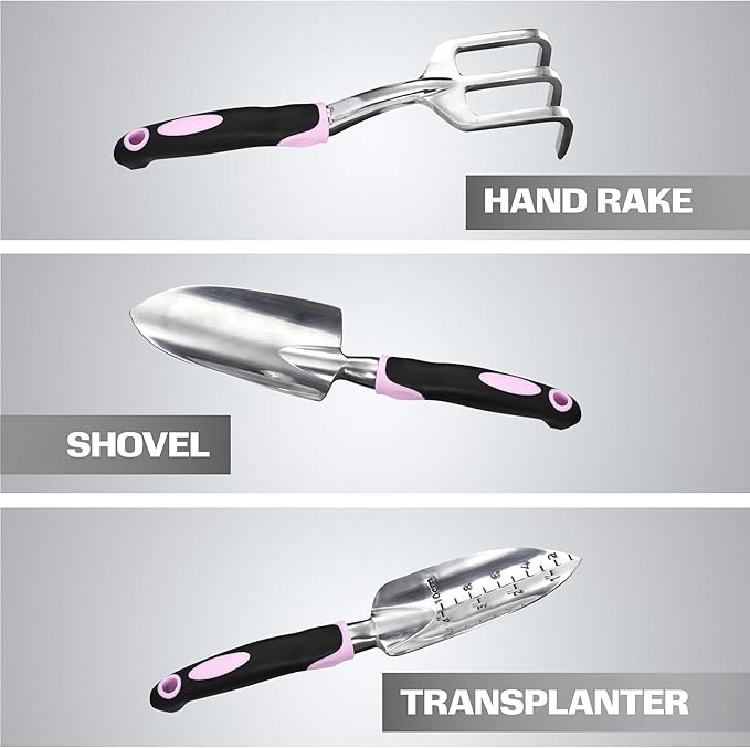 - VERSATILE GARDEN TOOLS: This set includes a spade, hand shovel, transplanter, and rake—perfect for digging, pruning, and weed control across all your gardening tasks.