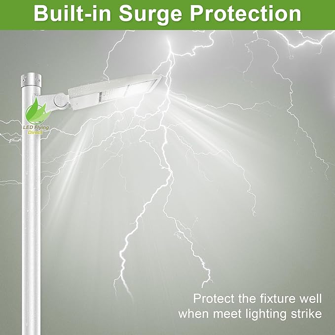 - Built-in Surge Protection: Our white finish 480V 300W LED parking lot light comes equipped with a built-in surge protection device, meticulously designed to shield the fixture from lighting strike. The incorporated surge protection acts as a safeguard against potential damage, ensuring the dependability and prolonged lifespan of the lighting system