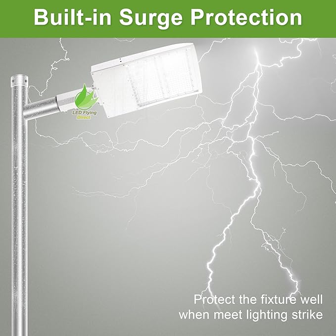 - Built-in Surge Protection: Our 480V 300W LED shoebox street light comes equipped with a built-in surge protection device, meticulously designed to shield the fixture from lighting strike. The incorporated surge protection acts as a safeguard against potential damage, ensuring the dependability and prolonged lifespan of the lighting system