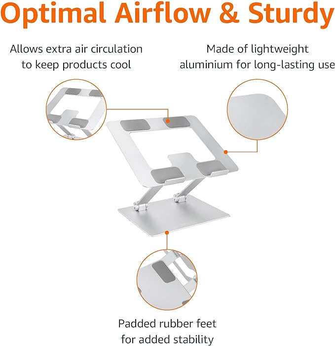 Amazon Basics Sturdy and Portable Ergonomic Laptop Stand for Desk, Adjustable Riser, Fits all Laptops and Notebooks up to 17.3 Inch, Silver, 10 x 8.7 x 6 in