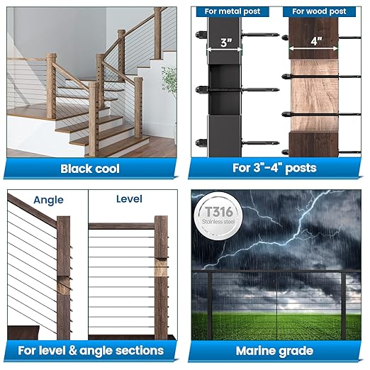 - Black cool & Marine Grade: The surface of this cable railing hardware is finished by the PVD black plating process, meeting the demand for modern black cool style of home construction. And it’s made of T316 stainless steel, which has excellent resistance to rust, corrosion and extreme weather, ideal for indoor or outdoor, even coastal applications
