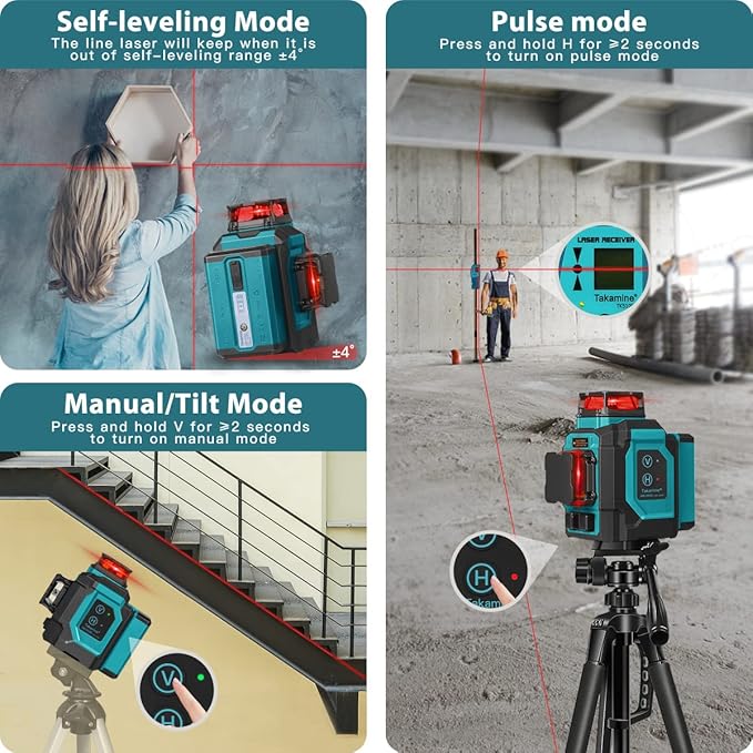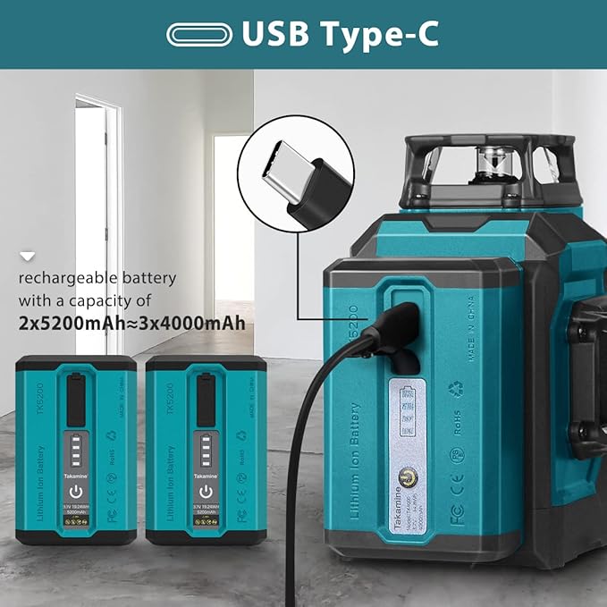 - Type-c Charging and Dual Power:This self-leveling laser level adopts the newly- developed red laser unit , which has finer and brighter light than green laser level.Newly upgraded Type-C charging is 60% faster than regular USB charging.Takamine laser tool employed large capacity lithium battery. An extra battery is included for backup to ensure you can work for long hours