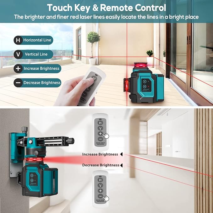 - Remote Control and Low-Temperature Operation:The new function button on the remote control adjusts the brightness of the laser line, making your calibration work more precise and faster.It can be resistant to low temperatures and operates more stably in cold environments than green lasers