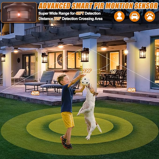 - 【Advanced & Smart Motion Sensor & Dusk to Dawn Sensor】Combined with superior PIR motion sensor & dusk to dawn photocell sensor, this exterior wall light fixture has ultra-sensitive motion detection function and 3 lighting modes (Auto, Auto+ energy-saving, manual override), giving you an extra sense of security when you come home at night. Motion sensor detection distance is from 0 to 40FT (detection range: 220°). Smart functions free your hands in daily life, promoting your living quality.