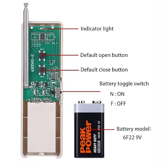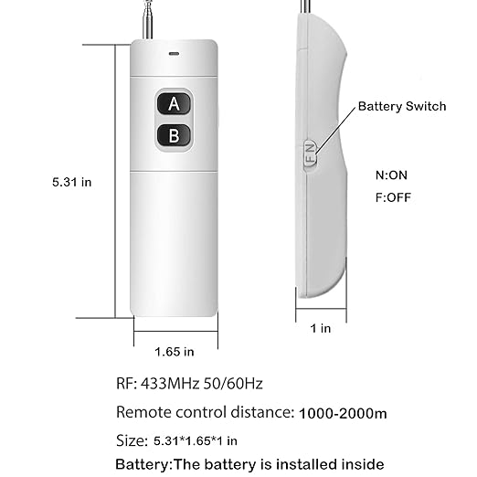 - (Long range remote switch): This 110 volt remote control switch has 500-1000m working distance, press button A-ON; Press button B-OFF (DC 9V battery is required, not included)