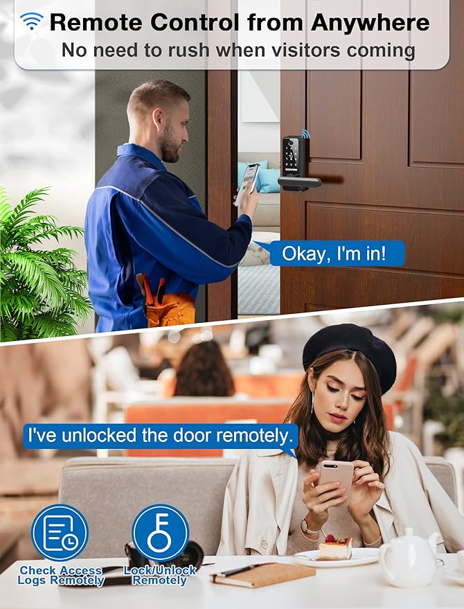 - 【Smart Door Lock Set with 6 Ways to Unlock】Our electronic door lock with handle provides 6-way unlocking options, including fingerprint recognition, app control, passcodes, keys, IC Card and even Alexa voice unlock (gateway included).