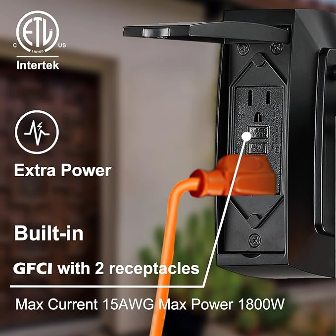 - Built-in GFCI Outlets-The exterior wall light with 2 GFCI outlets(Ground Fault Interrupter) is available for two-pronged and three-pronged plugs, which is more easy to power outdoors. This design is suitable for various occasions, such as BBQ, string lights, security camera, gardening tools.