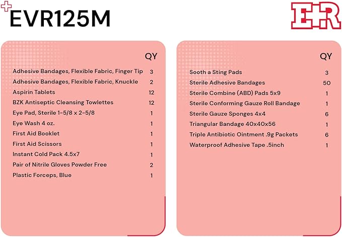 - BE PREPARED AND PROTECTED: This emergency kit it is made to treat up to 25 people and contains 107 essential first aid supplies from bandages to burn cream to cold packs and more! The kit is perfect for treating small injuries in your office, vehicle or worksite. Keep yourself and your workers protected in an emergency by having the Ever Ready First Aid Kit on hand.