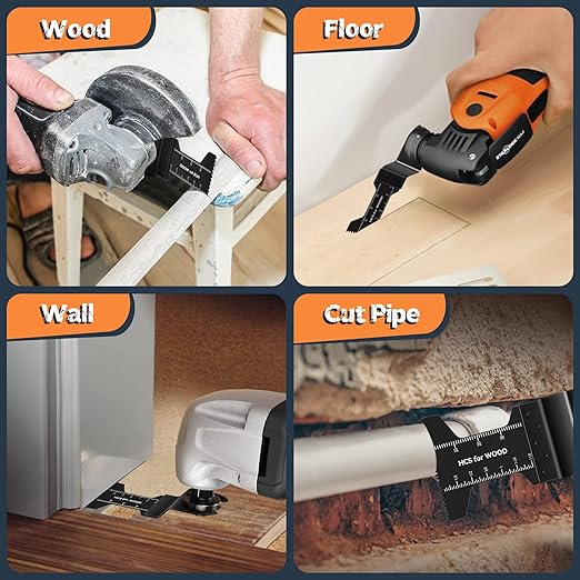 - Tougher & Thicker Blades - This set of multi tool blades is made of alloy steel and high carbon steel, which have been processed using a special technology to ensure excellent wear resistance and long service life for each saw blade. Easily cut through wood, plastic, plasterboard and more. (NOTE: Not suitable for cutting metal nails and hard woodfloor)