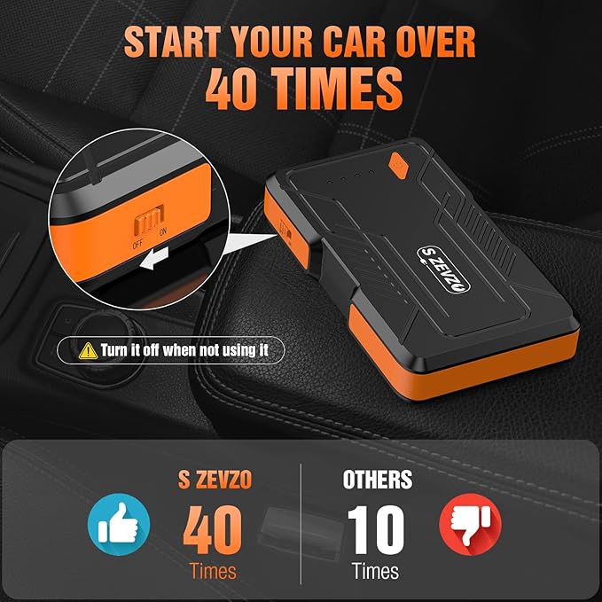 - 【 START ALL 12V CARS 】 S ZEVZO car jump starter with 1000A peak current, which can start a dead battery up to 40 times on a single charge. This portable jump starter battery pack can quickly jump start a car battery up to 7.0L gas or 5.5L diesel engines in seconds, suitable for all 12V cars, trucks, motorcycle, boat, SUV, lawnmowers, snowmobiles, etc. In an emergency, you no longer have to wait helplessly at the roadside for help. You can easily and quickly solve problems by yourself!