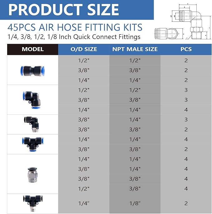 - AIR LINE FITTING KITS SET: Air hose fitting kit package includes 45 pcs fittings: 16 pcs straight push connectors. 10pcs 90°elbows connectors. 6pcs straight tube union connectors. 6pcs tube tees. 5pcs 90°elbows NPT Thread . 2pcs 90°tee NPT Thread Push fitting types: 1/4", 3/8", 1/2",1/8"