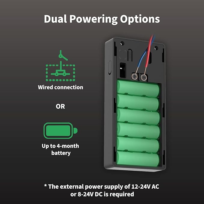 - 【Long Battery Life and Wired Powering for the Doorbell Main Module】 The G4 can be powered by a 6 AA 1.5V battery pack (batteries are included) or connected to existing doorbell wiring** for constant power. (**Doorbell transformers and power supplies of 12-24V AC and 8-24V DC are supported). The doorbell's dimensions are 5.57” x 2.56” x 1.20” and it is recommended to be installed on a porch or shaded area.