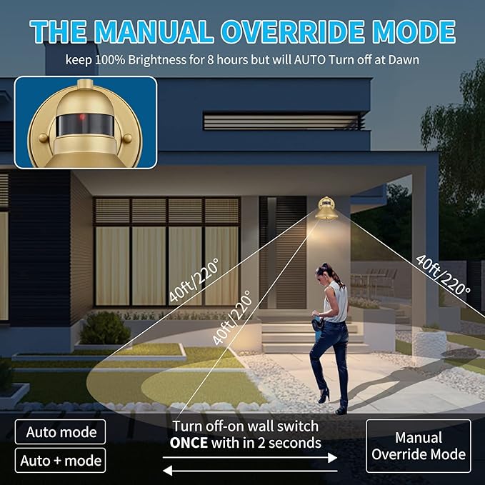 - 【Unique Manual Override Mode】In order to make the outdoor light fixtures wall mount suitable for more scenes, we have added an additional 8-hour constant light mode, Just turn the wall switch “off-on” with 0.5~2sec. to shift to manual mode from auto one, keeping 100% brightness at night, but will auto turn off at dawn.