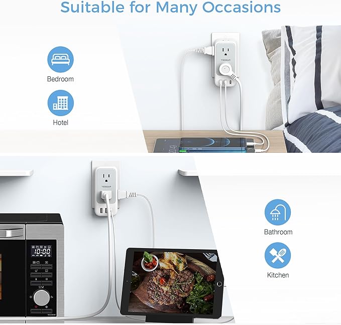 - Applicable Wall Outlet Types: TESSAN Wall plugs with USB is compatible with standard receptacle, decor receptacle, USB receptacle, GFCI receptacle; Multi plug outlet is suitable for bedroom, bathroom, kitchen and college dorm room