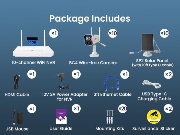 - 【All-in-1 Plug-N-Play Camera Kit】This is a prepackaged camera set with 10 security cameras, a 10CH expandable NVR and needed accessories. The standalone surveillance system works instantly out of box. You only need to plug the NVR to a screen and turn on the cameras to start monitoring your properties.