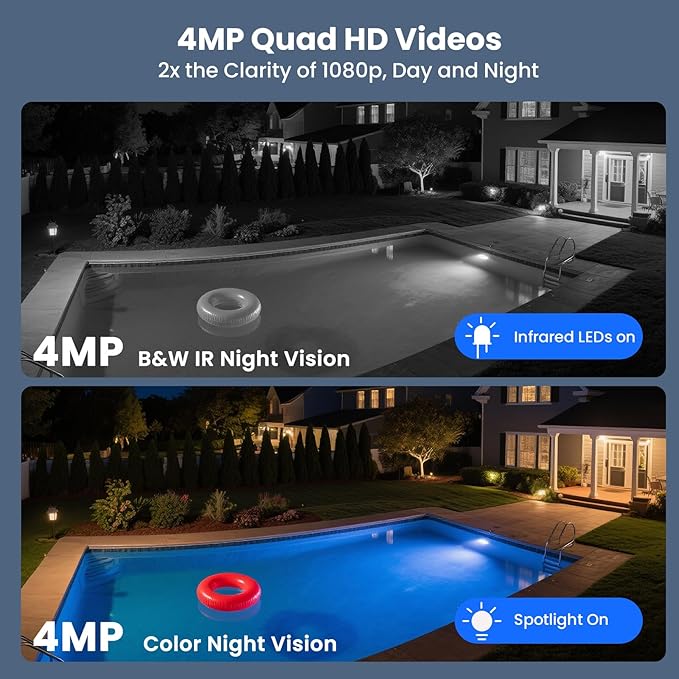 - 4MP Quad-HD Day & Night Videos: The outdoor camera wireless have 2 times that much pixels of 1080p, captures clear videos day and night. The 4 professional IR + floodlight 2-in-1 LEDs help the cameras to see crystal clear black & white night vision even in pitch darkness (up to 150ft), or capture color night vision with the flood lights on (appr. 20ft). You can easily switch light modes among IR, flood lights and AUTO, right from the phone App.