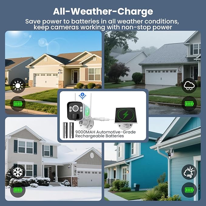 - Non-stop Solar Power: The 9000MAH large capacity automotive-grade rechargeable batteries store more-than-enough power, and the solar panels replenish power every day, regardless it’s sunny, rainy or snowy. The All-Weather-Charge Technology keeps the cameras work with non-stop power even in winter, saving the troubles of taking cameras down for recharge. You can also use a 5V phone charger to keep the camera plugged and work with 24/7 monitoring, protecting your properties and loved ones.