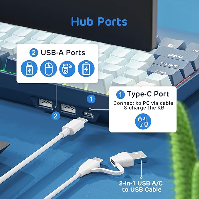 - Hub Design - This wireless mechanical keyboard is armed with 2 built-in USB pass-through ports and 1 Type-C Port, allowing to back up more facilities, like a mouse or a headphone.