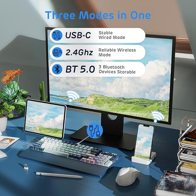- BT5.0/2.4G/USB-C - Believe it or not, this is the first generation of three-mode wireless keyboards. Wireless mode with stable BT5.0, hassle-free 2.4Ghz dongle plus USB-C wired mode set no limits about your keyboard connection.