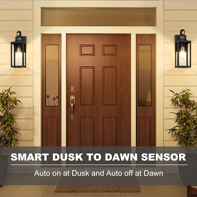 - Extra-Wide Detection Angle:Our dusk to dawn outdoor porch light with a 220° super wide detection angle, which can widen brightness area and keep your safety. With black classic look, this wall light is suitable for garage, garden, patio, entryway, courtyard, etc