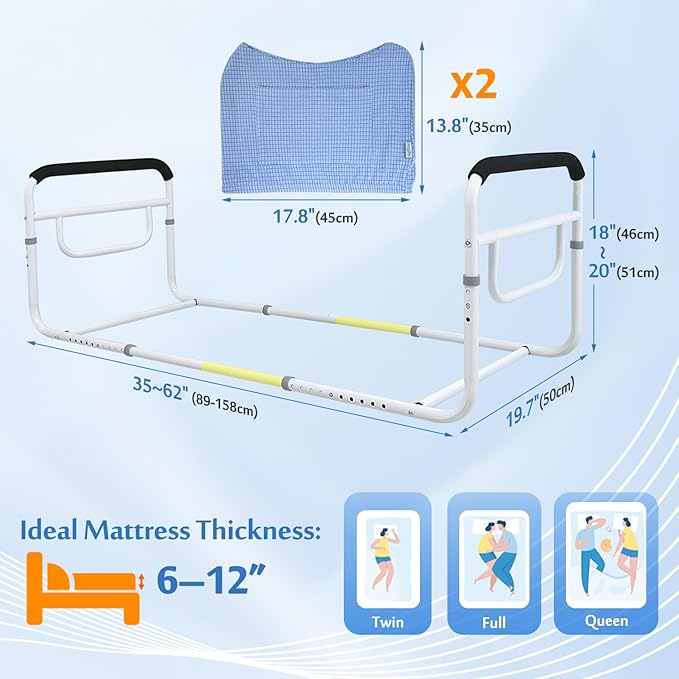 - 【Double Bed Rail】Dual-sided guardrails provide full-length protection to prevent your loved ones from rolling off the bed, reducing the risk of falls and re-injury. Holding the rails on both sides offers better support when getting in and out of bed.