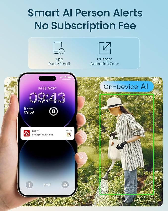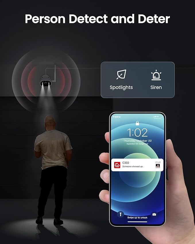 - 【Smart Human Detection & Spotlight Siren】--Advanced AI analytics accurately identifies people, reducing false alerts. The automated defense system activates a bright spotlight and siren upon detecting human motion, with instant mobile alerts. Manually trigger alerts via the app to deter suspicious activity.