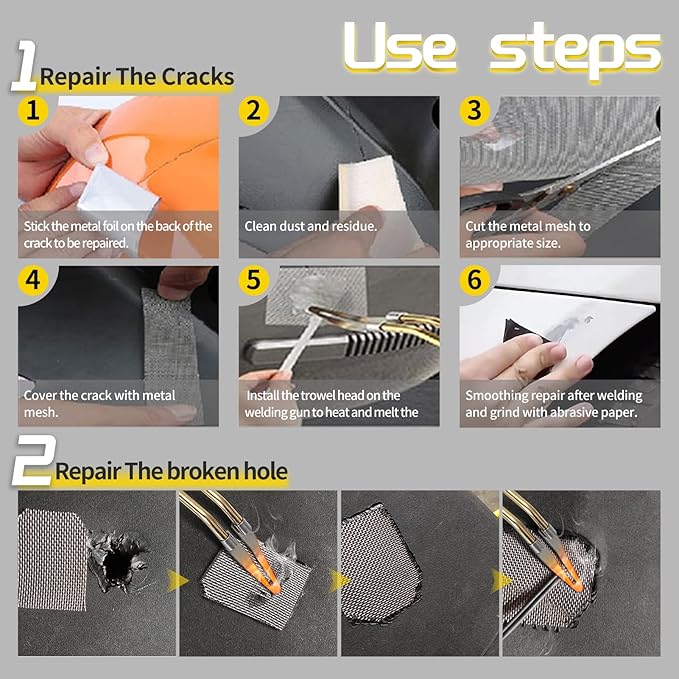 - Easy to Use:The plastic welding kit has anti scald protection function,firm welding,easy operation and portability. just press the button to heat and weld the staples into the plastic.The head light illuminates when in use.Comes with different types of welding heads and plastic welding rods, the metal staples will make the broken parts stronger than they were originally.