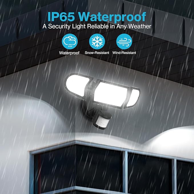 - Light Up Wide Coverage: This 9,000 lm motion lights for outside lights up yards, garages, driveways, and more. Its 3-headed adjustable design provides 270-degree coverage, illuminating up to 1350 square feet to enhance home security at night