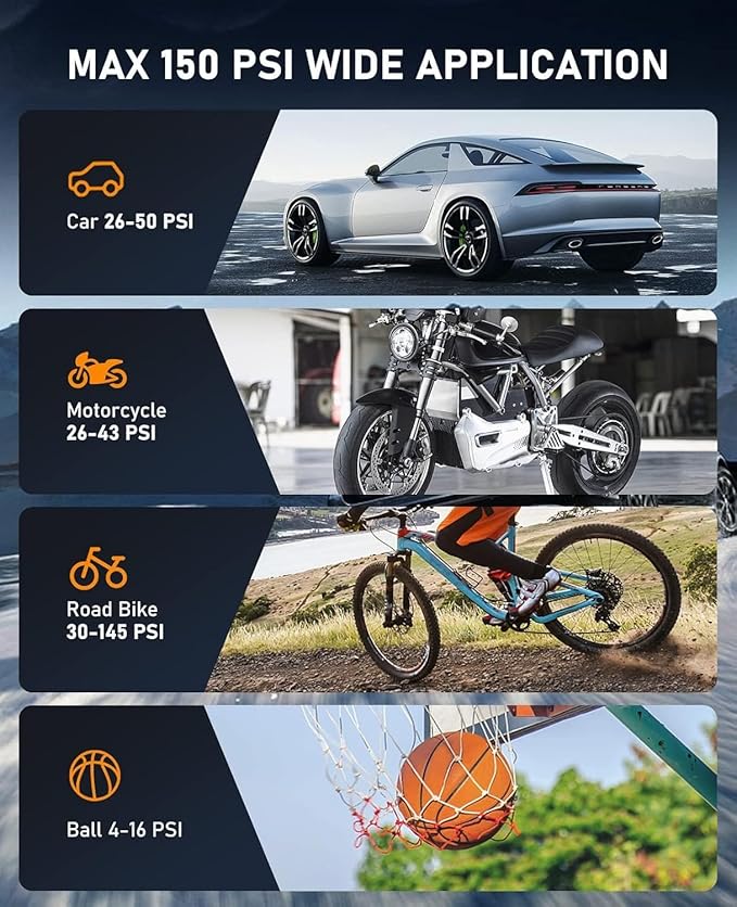 - Compact, Durable, and Always Ready: Sleek, lightweight, and tough enough for daily use, this air pump fits easily in your glove box or backpack. Whether you're at home, on a road trip, or off the grid, it's the compact solution you can count on—no need to rely on gas station air ever again.