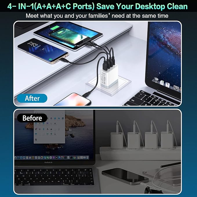 - 【4-Pack 4-IN-1 USB Charger】: Includes 4-Pack 35W 4-Port [USB-C + 3*USB-A] Wall Chargers, allowing simultaneous charging of multiple devices. Say goodbye to your old charger and give one as a gift to your friends. When connecting more than two devices, power is efficiently distributed between ports to ensure optimal charging.