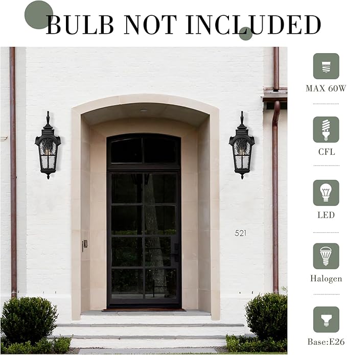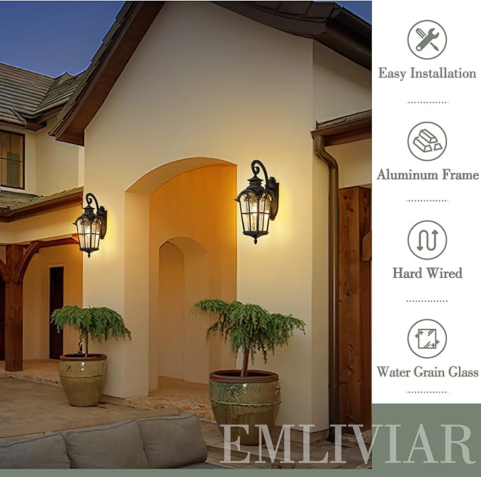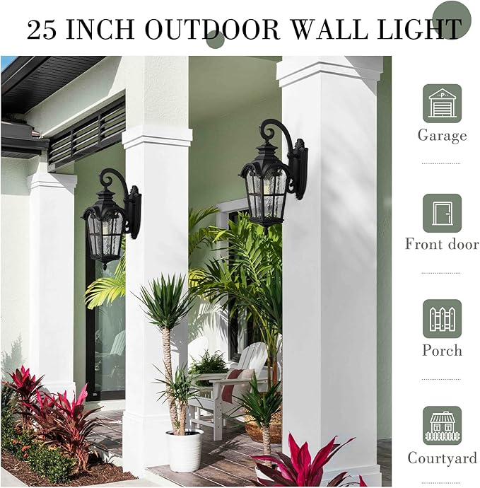 - Weather-resistant and rust-resistant, this large wall mount outdoor light features sturdy aluminum construction with water grain glass, suitable for wet locations. The black finish suits any house decoration.