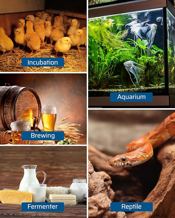 - 【Safety&Caveat】120VAC/10A/1200W power rating and SJT 18AWG power cord ensure your safety. Compressor delay function to protect your refrigeration/heating equipment. Do not immerse the reptile thermostat or probe in water.