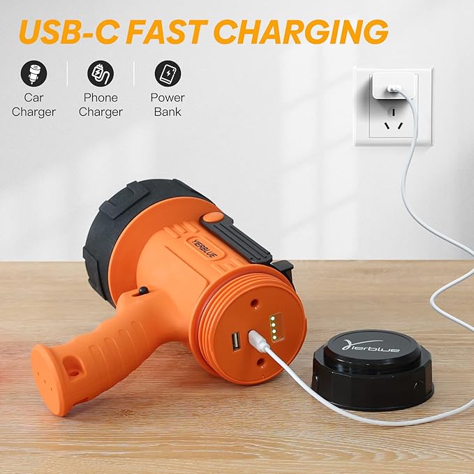 - [High-Speed Charging] This 1000 lumens hand held spot lights comes with 1.2m Type-C cord, Charge phone at high-speed via the 18W USB-C port, or get a powerful charge for tablets and other mobile devices via the 18W USB-C port.(Adapter not included)