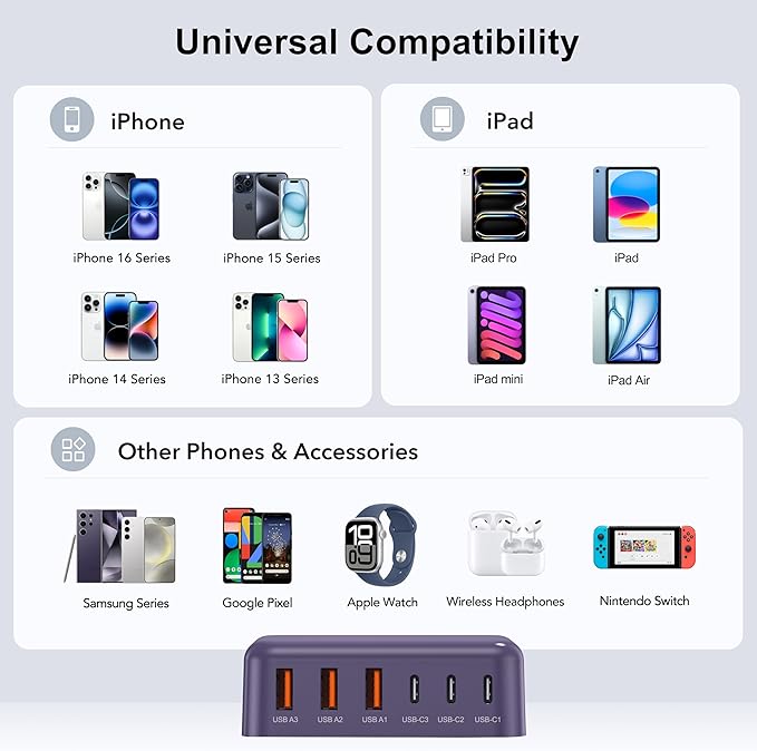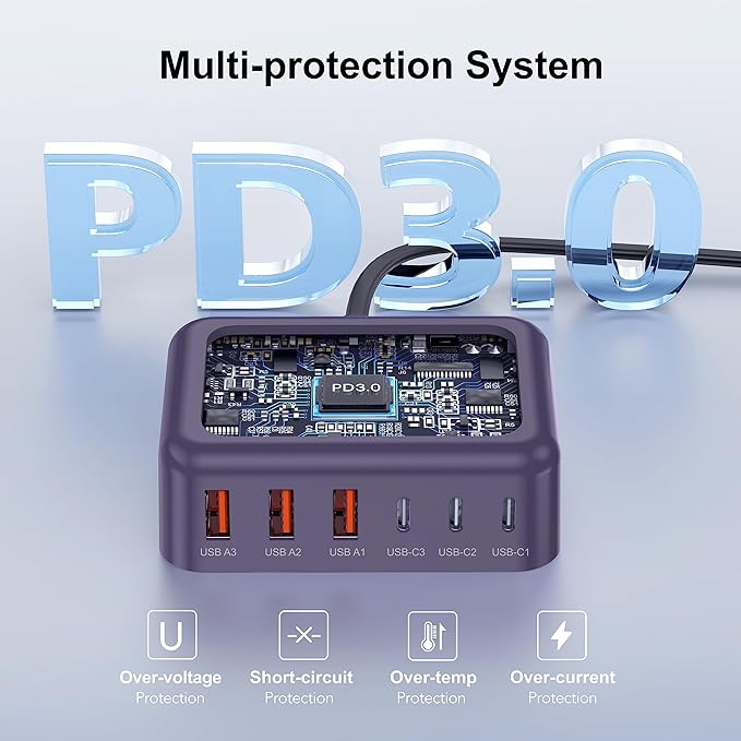 - ⚡【Fast-Speed Desktop Charging Station】Only 30 minutes, charge your phone to 60%. 6 in 1 Charging blocks with 3 x USB C PD 3.0 port (20W max), 3 x USB port(18W max), this charger supports a maximum output of 100 watt in total. No need to wait, it can charge your watch, earphone, mobile phone, fan and other 6 different devices at the same time.