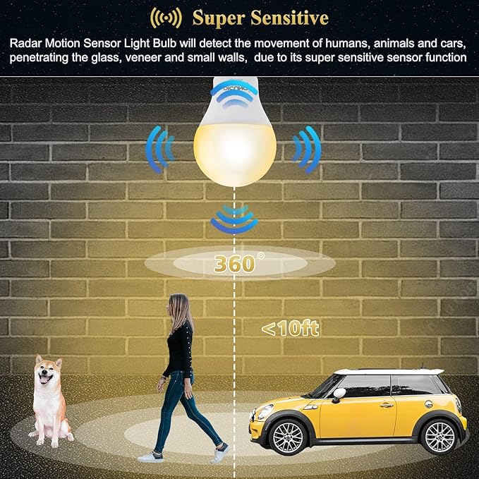 - Wide Application: Motion Sensor Light Bulb Radar is perfectly suitable for the front porch, front door, garage door, entryway, basement, laundry, closet, driveway, backyard, patio, etc. With the standard E26 base, it is your ideal replacement for high energy-consumption incandescent bulbs.