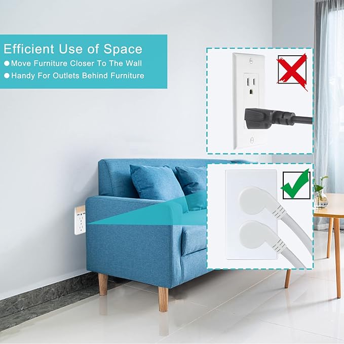 - 【Efficient Use of Space】With the flat profile of the wall plug, it makes the cord less obvious and allows you to place something in front of it, almost flush with the wall. Save a lot of space,move furniture closer to the wall.
