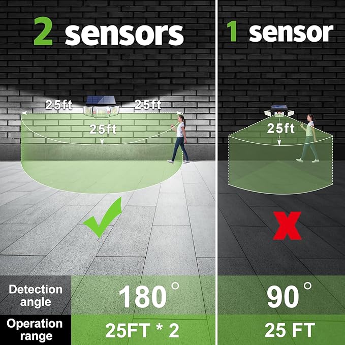 - Innovative Dual Sensor Design: The intelamp waterproof solar motion sensor lamp incorporates a dual-sensor design that detects movement over a significantly larger area than traditional single sensors, providing 180-degree coverage. This ensures comprehensive detection across an entire wall, even triggering from side approaches, enhancing security by reducing blind spots.