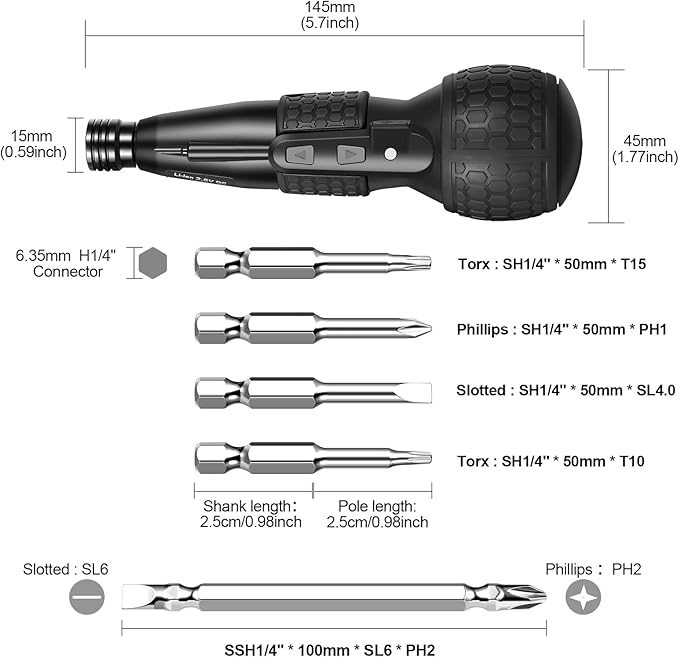 - 【Complete DIY Starter Kit】Includes screwdriver, 5 bits (Torx/Phillips/Slotted), USB-C cable, and storage case. Ideal for furniture, electronics, and home projects.